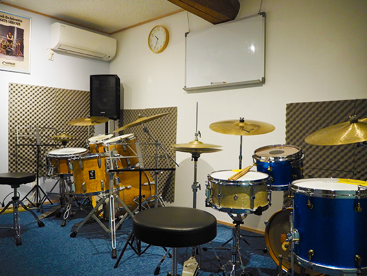 ドラム2台を使ったプライベートスタジオでのマンツーマンによるレッスン。プレイアロング(カラオケ音源)を使った実践レッスンも行います。すでに多くの方にご利用いただいています。新型コロナ対策としてレッスン前後の設備の消毒はもちろん、室内の換気設備も導入済み。子どもから大人まで、初心者からプロ志向の方まで、随時生徒募集中!
